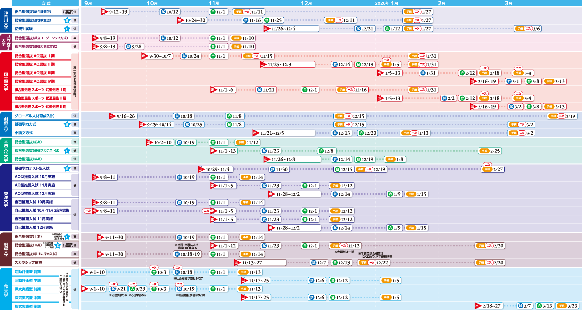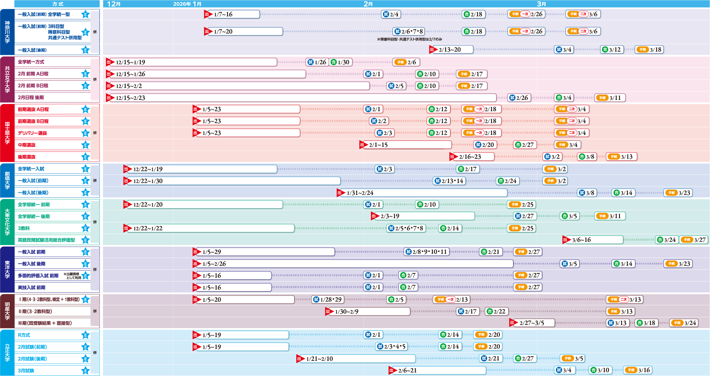 大学ごとに異なる入試スケジュール。出願期間や試験日、合格発表、さらには入学手続きの締切まで、しっかりと把握しておくことが、第一志望校への道の第一歩です。本コーナーでは、各大学の入試スケジュールを一覧でご紹介。計画的に準備して本番に臨みましょう!