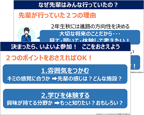 - ※進路検討の初級者向けの内容です。大学進学希望者向けのオープンキャンパス指導には「進路研究のススメ」講演がおすすめです。