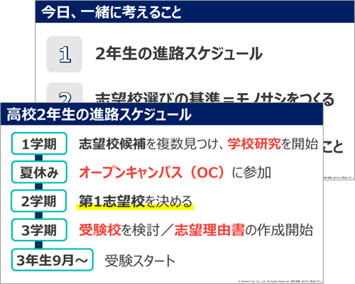 - 併願校を意識して複数の志望校を検討し、進学に必要な準備が開始できる
