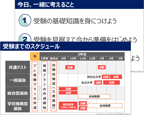 いつも苦労する受験科目の見方がわかり、スムーズに面談に進めると思った。 - 入試の仕組み等も詳しく、丁寧な説明で分かりやすかった。長期的に受験を考えることが苦手な生徒もいるため、現段階でのやるべきことが見えたと思う。